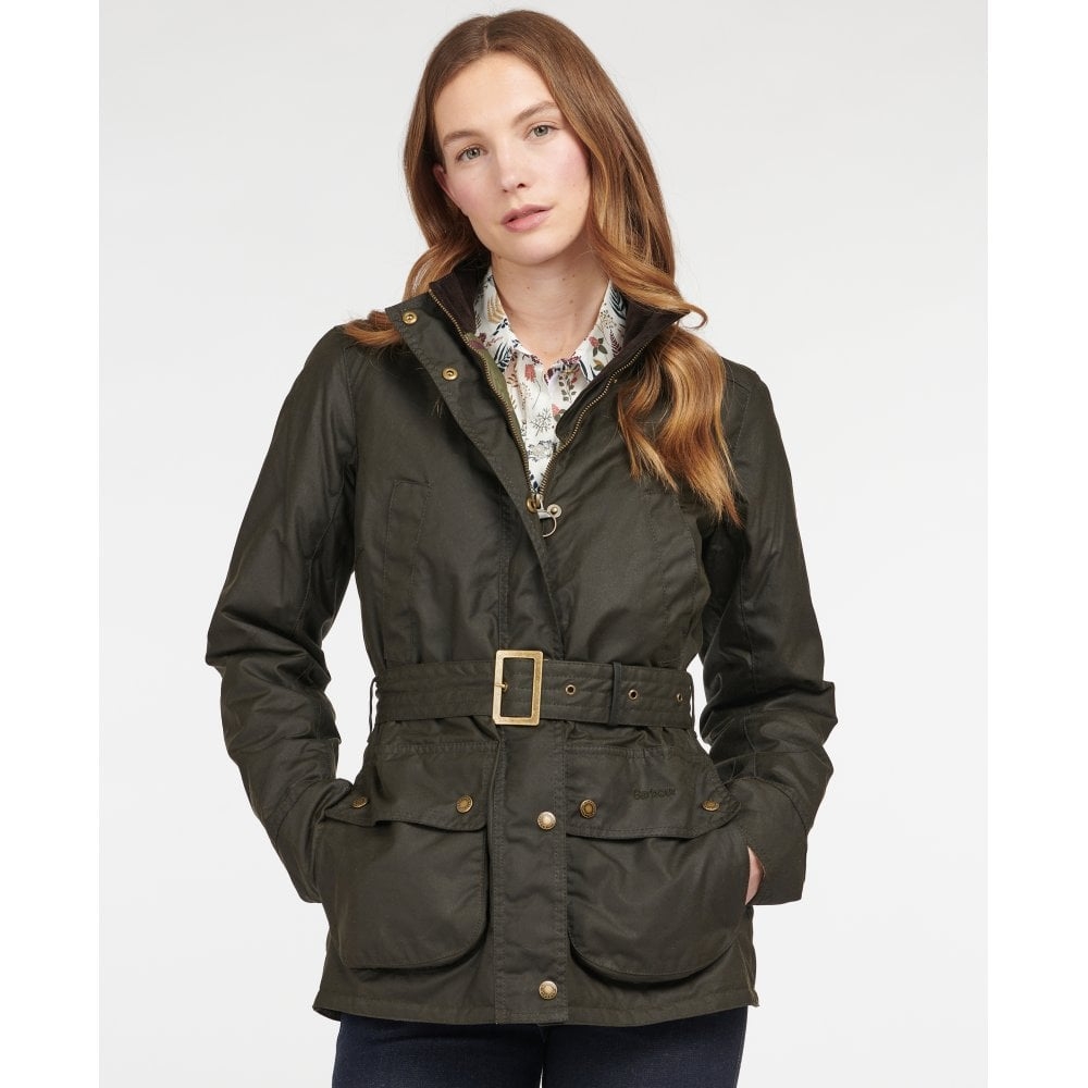 Refresh your country look with the Women's Barbour Montgomery Waxed Jacket. Made from 100% waxed cotton, this jacket offers protection from the elements and boasts that classic Barbour look that we all know and love. Perfect for autumnal walks in the countryside, the jacket has Barbour's signature style and is complete with a waist belt, a funnel neck and four front pockets for convenience. The timeless design is finished with subtle branding to the left pocket. The Montgomery promises to be your go to outerwear for many autumns and winters to come.
